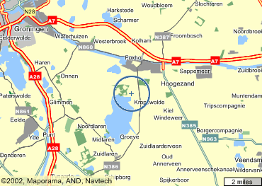 Neem afslag Foxhol en rijdt richting Zuidlaren, u komt over een brug over het Winschoterdiep.